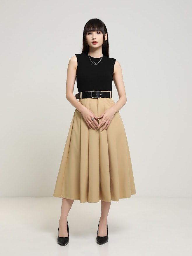 Crafted from soft, stretchable cotton for a comfortable yet structured fit. It features a fitted bodice that contrasts elegantly with the flared skirt, creating a flattering silhouette. The design includes a side zip for easy wear and a sleek black belt that cinches the waist, enhancing the overall shape. Effortlessly chic, this piece is perfect for both casual outings and semi-formal occasions.